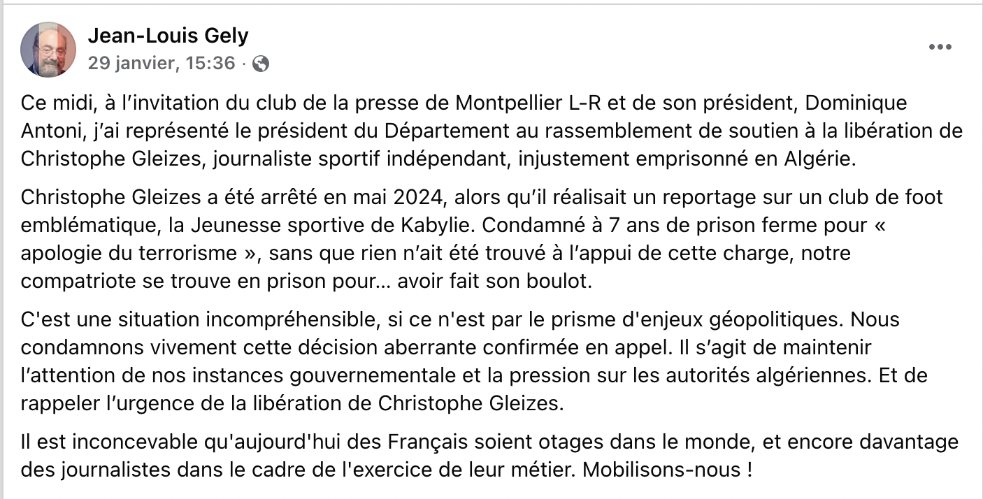 On peut noter avec satisfaction que, contrairement à ce qui s’est produit dans le cas de Boualem SANSAL, les demandes pour la libération de Christophe GLEIZES commencent à se multiplier, notamment dans le monde du football.
