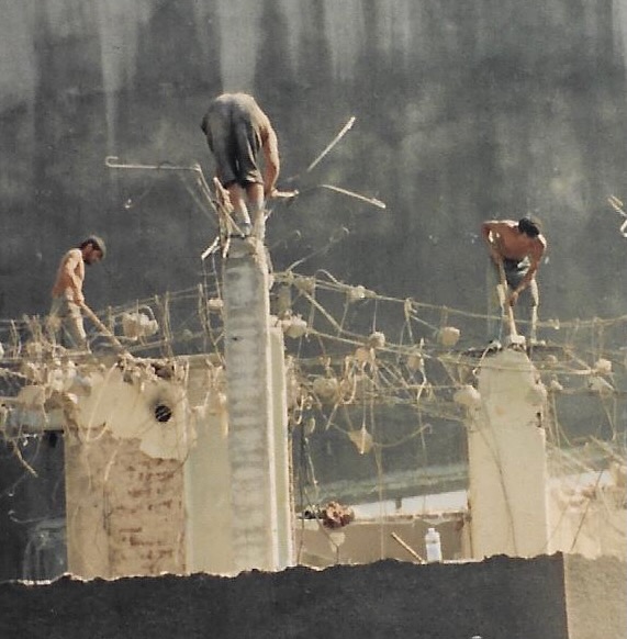 des ouvriers qui détruisent à la masse les hauts et étroits piliers de béton sur lesquels ils sont juchés