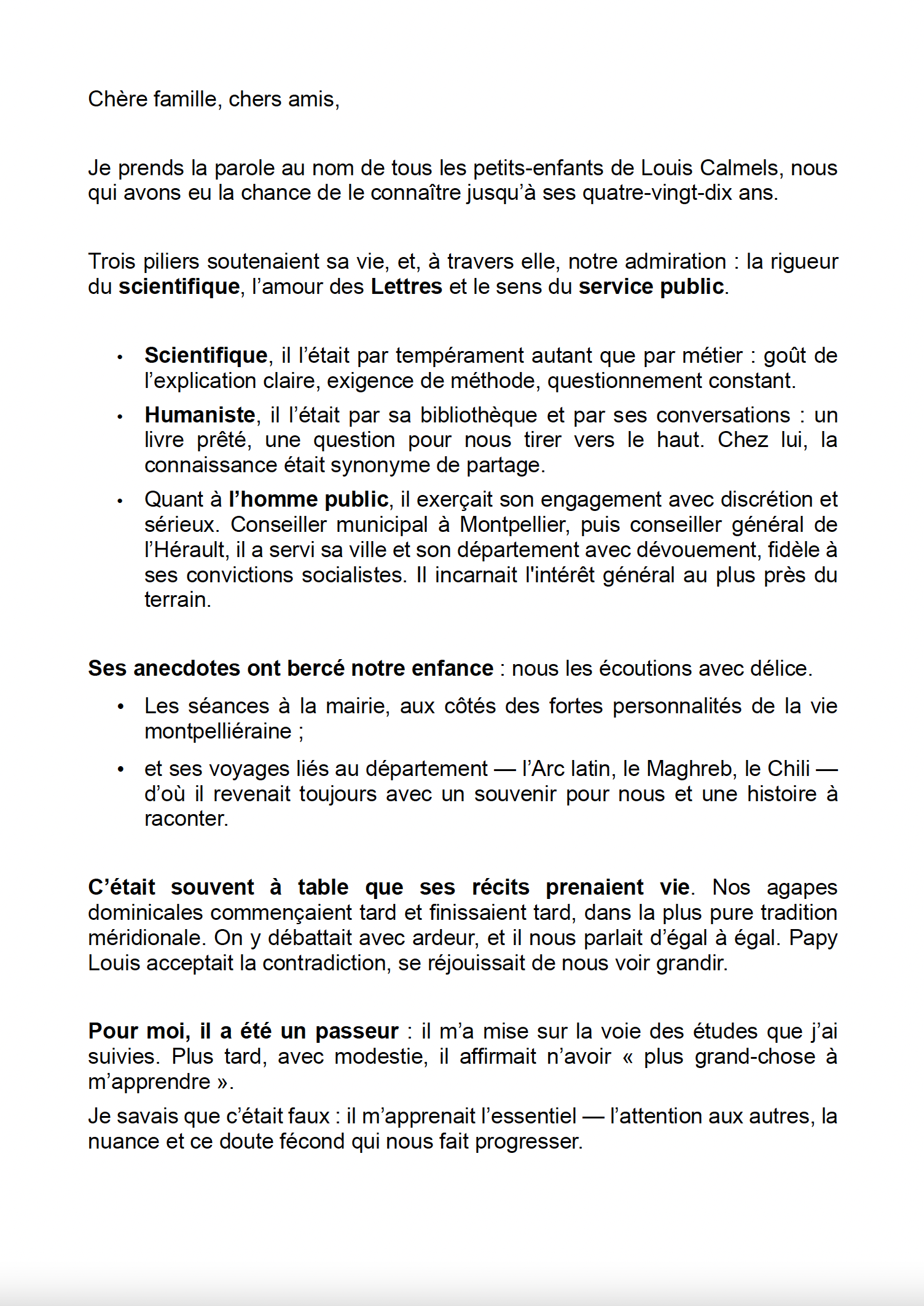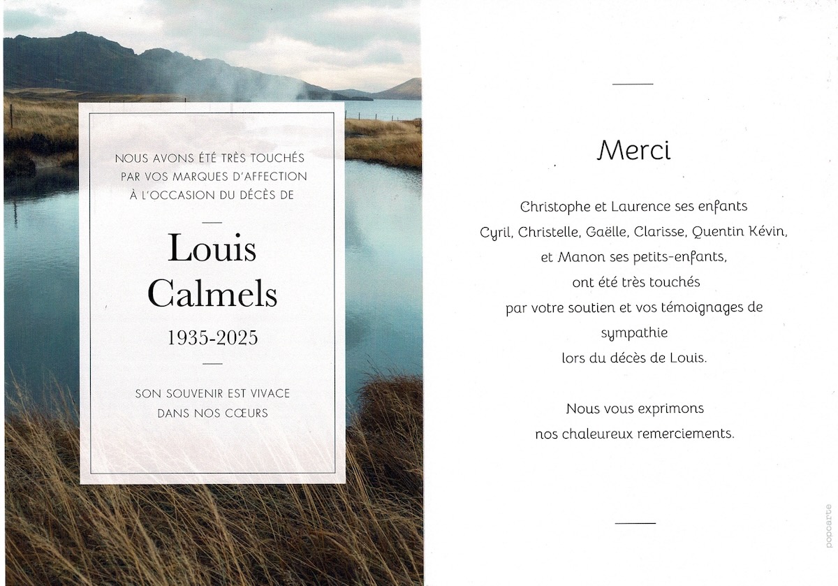 [Le 9 octobre 2025, 16 H50, J-C. G., Montpellier] : Profondément attristé en apprenant le décès de mon ami Louis CALMELS. J’aimais sa gentillesse, son humour qui témoignaient combien Louis était un homme de qualité. Nous perdons un véritable AMI. J’adresse à ses enfants et à ses proches mes plus sincères condoléances, m’excusant, en raison de mes handicaps, de ne pouvoir accompagner Louis lors de ses obsèques. J’ai aussi une pensée pour sa regrettée épouse qui fut un merveilleux professeur pour deux de mes fils. Jean-Claude GEGOT