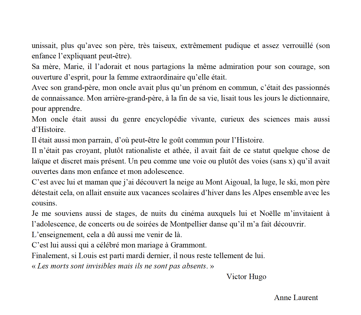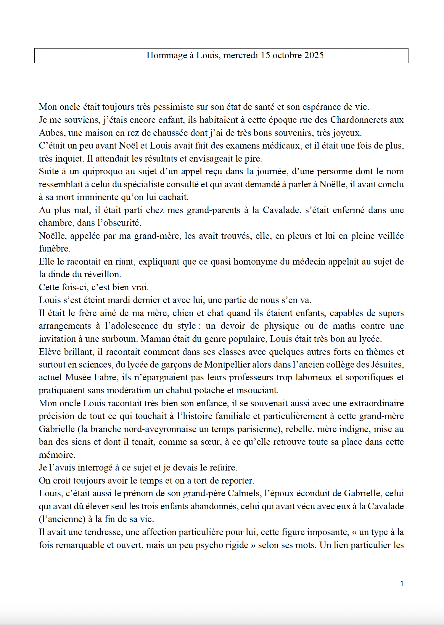 [Le 8 octobre 2025, 17 H50, J-L. G., Montpellier] : Je viens de recevoir le message funeste qui nous apprends le décès de Louis. Merci d’avoir diffusé immédiatement l’information. Je regrette de n’avoir pu venir à La Faluche ces trois derniers mercredis, ayant été absent de Montpellier les deux semaines précédentes et retenu de nouveau aujourd’hui.