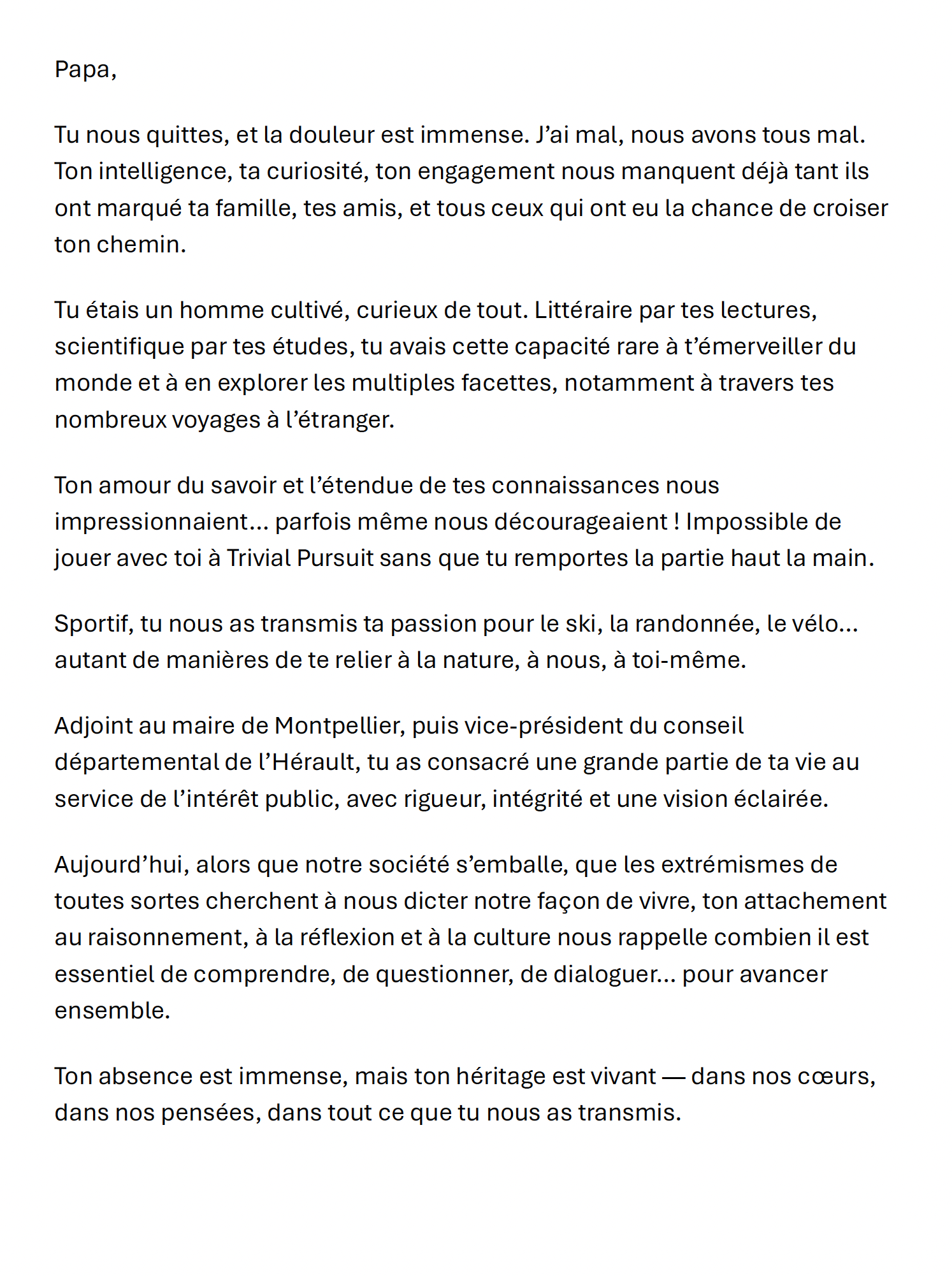 [Le 9 octobre 2025, 12 H35, P. B., Claret] : Merci pour les informations. Malheureusement je ne serai pas dans la région mercredi 15 octobre. Je partagerai cependant la peine de tous ses amis par la pensée et la prière. Amicalement. Pierre BECQUÉ